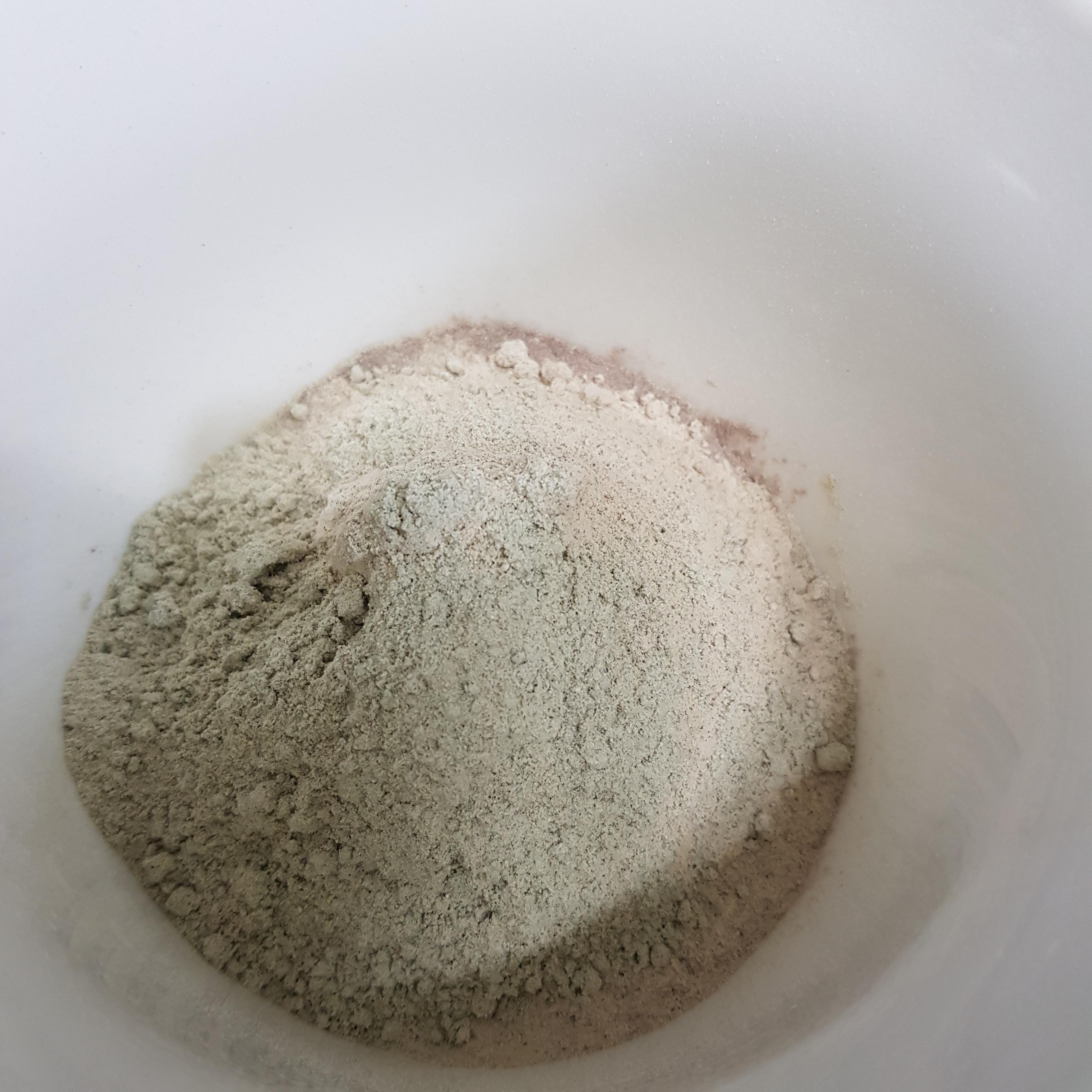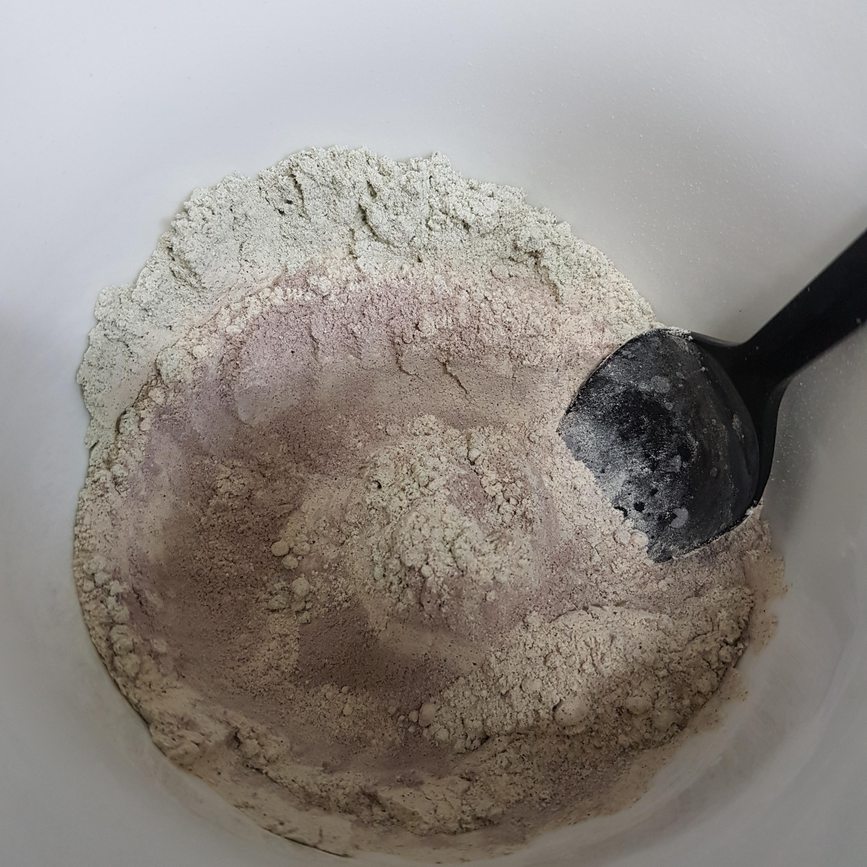 2) 차전자피 가루 2봉, 단백질파우더(초코맛), 쑥가루, 팥가루, 미숫가루, 소금을 섞어놓는다.
