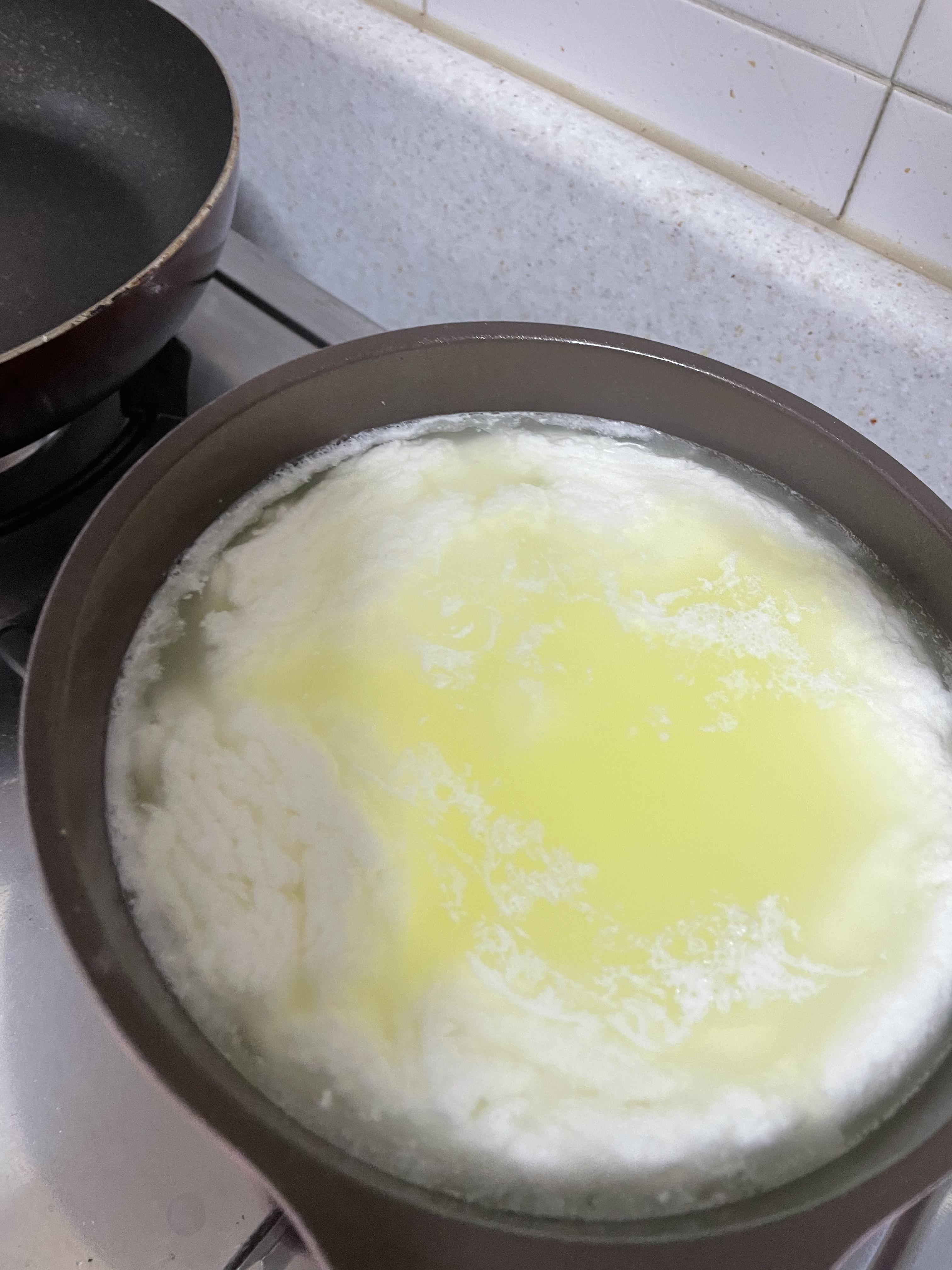 2. 냄비에 유청과 우유를 1:1의 비율로 넣고 끓인다.